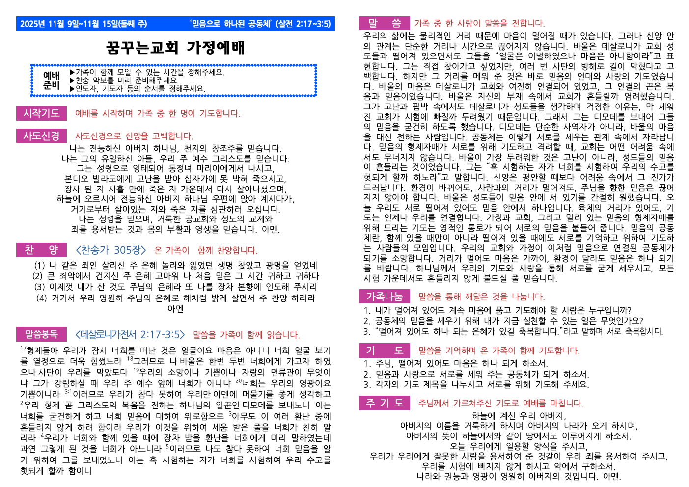11월 2주(11월 9일~11월 15일) 가정예배 순서지