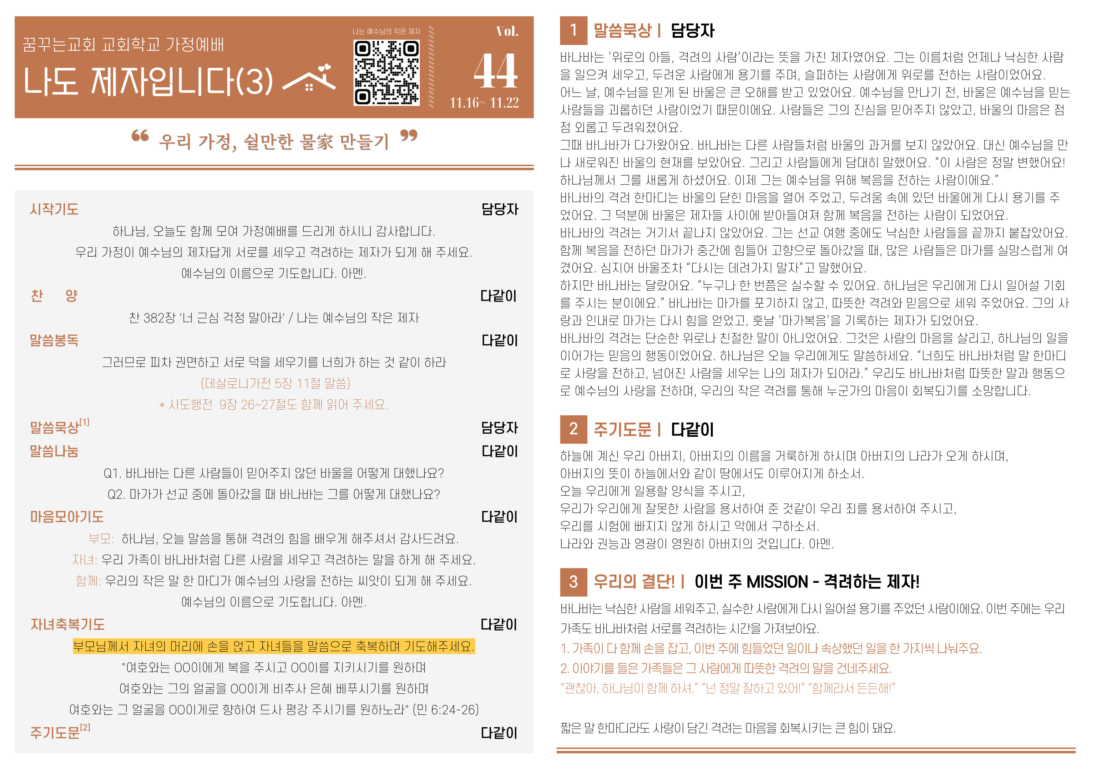 11월 3주(11월 16일~11월 22일) 가정예배 순서지 : 나도제자입니다3 [교육부]