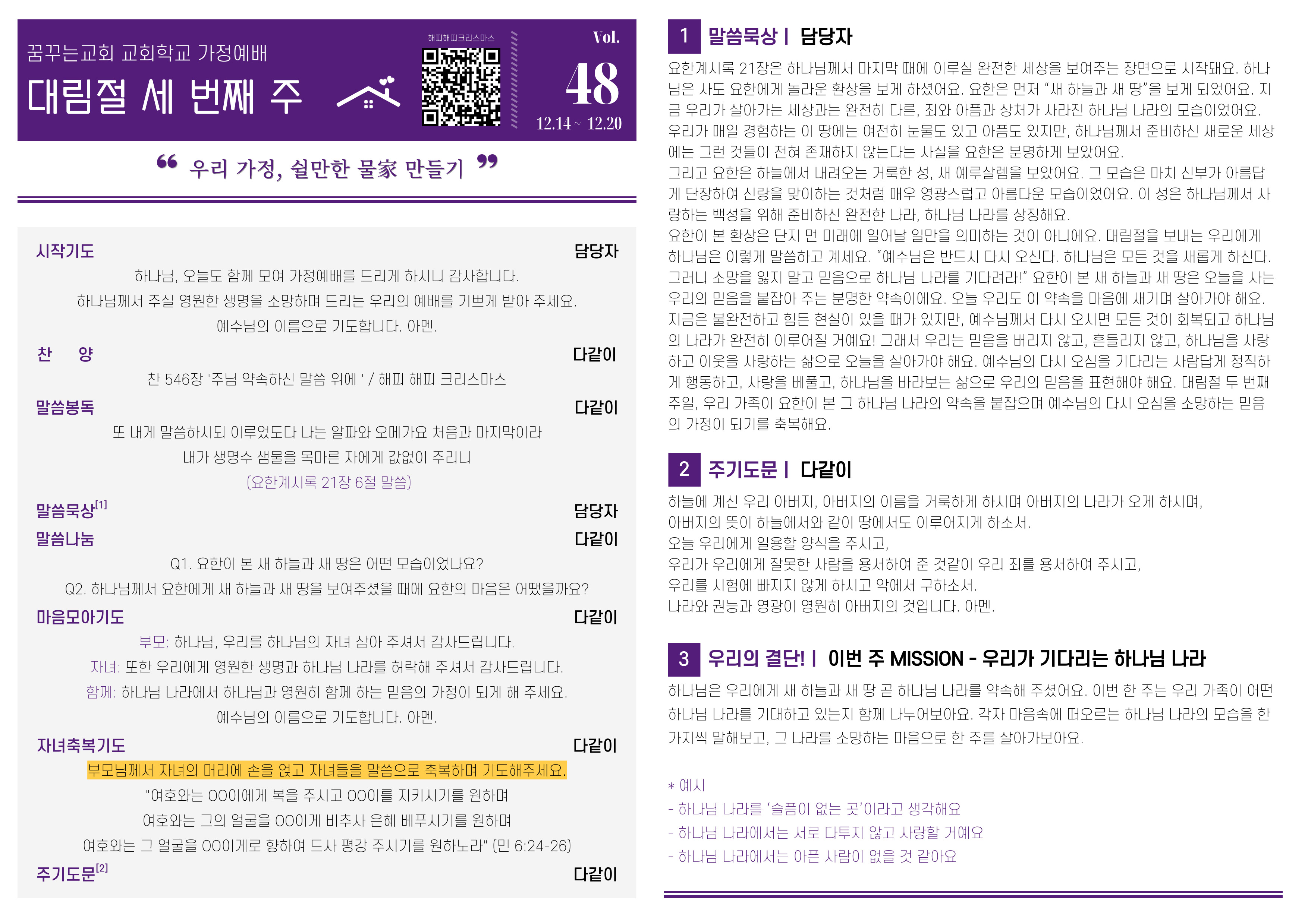 12월 2주(12월 14일~12월 20일) 가정예배 순서지[교육부] + 가정예배 설문지