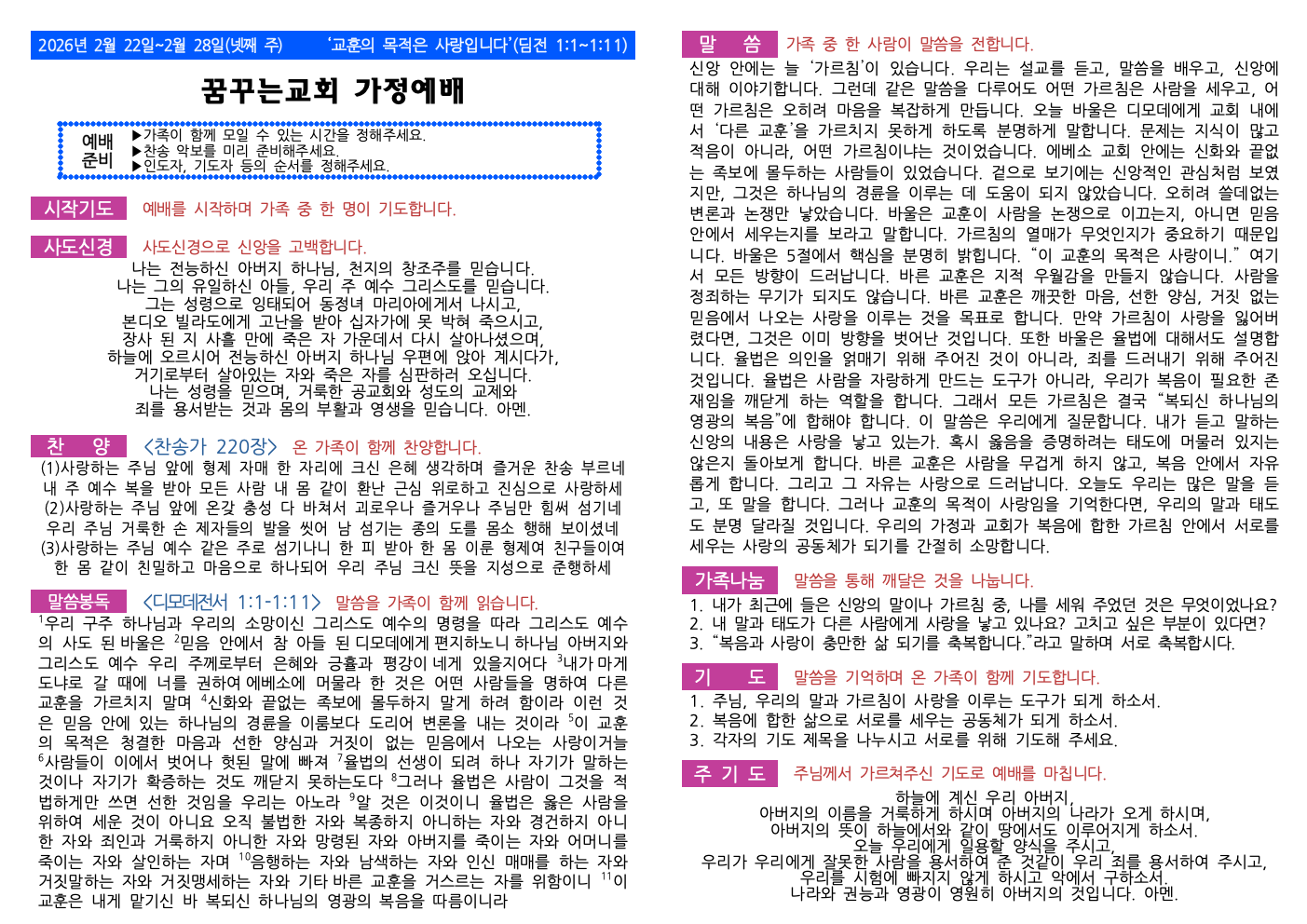 2월 4주(2월 22일~2월 28일) 가정예배 순서지